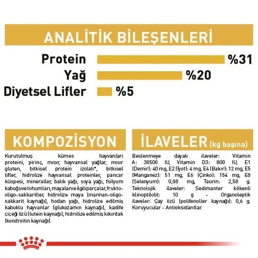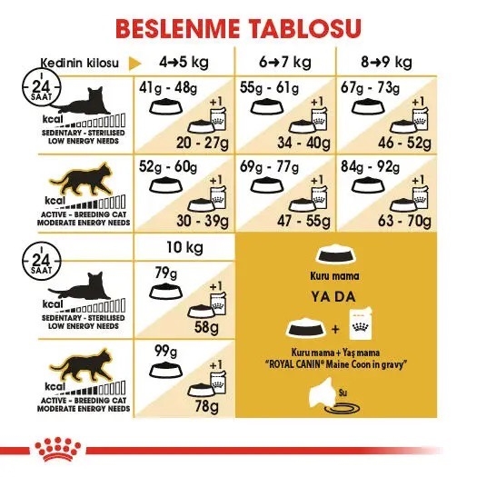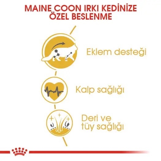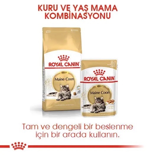 ROYAL CANIN® Maine Coon Yetişkin maması, bu özel ırkın ihtiyaçları dikkate alınarak özel olarak formüle edilmiştir. Maine Coon kedinizin beslenme ihtiyaçlarının karşılanması sizin için olduğu kadar bizim için de çok önemlidir. Maine Coon dünyanın en büyük evcil kedi ırkıdır ve devasa gövdesinin altında son derece uysal bir mizaç yatar. Güçlü kemik yapısı ve kaslı gövdesiyle ortalama bir kediden üç kata kadar daha ağır olabilir. Büyük cüssesi ve kemik yapısı nedeniyle, eklemlerinin genel sağlık ve durumunun korunmasına özen gösterilmelidir. ROYAL CANIN® Maine Coon Adult mama, sağlıklı kalp işlevinin korunmasına ve desteklenmesine yardımcı olan Taurin, DHA ve EPA (Omega-3 yağ asitleri) ile zenginleştirilmiştir. Maine Coon ırkı kediler, mamalarını kavrayıp çiğneme biçimlerini onlara özgü bir hale getiren büyük bir çeneye sahiplerdir. Bu nedenle, ROYAL CANIN® Maine Coon Adult mama, hayvanın ağız sağlığının korunmasına yardımcı olan çiğneme süresini uzatmak amacıyla büyük boy ve küp şekilli olarak tasarlanmıştır. Her kedinin bireysel tercihlerine yanıt verebilmek amacıyla, ROYAL CANIN® Maine Coon Adult lezzetli bir ıslak mama biçiminde de sunulmaktadır. Karışık beslenme uygulamayı düşünüyorsanız, kedinizin ideal oranda ıslak ve kuru mama almasını sağlamak için beslenme yönergelerimizi inceleyin.