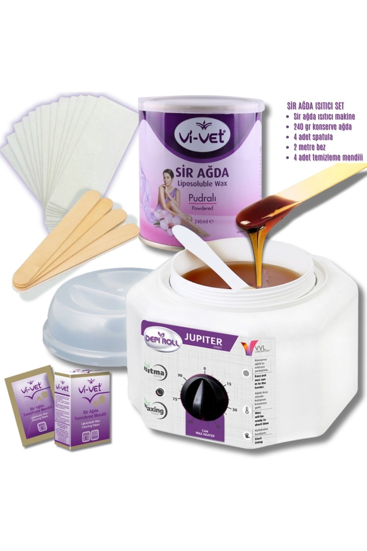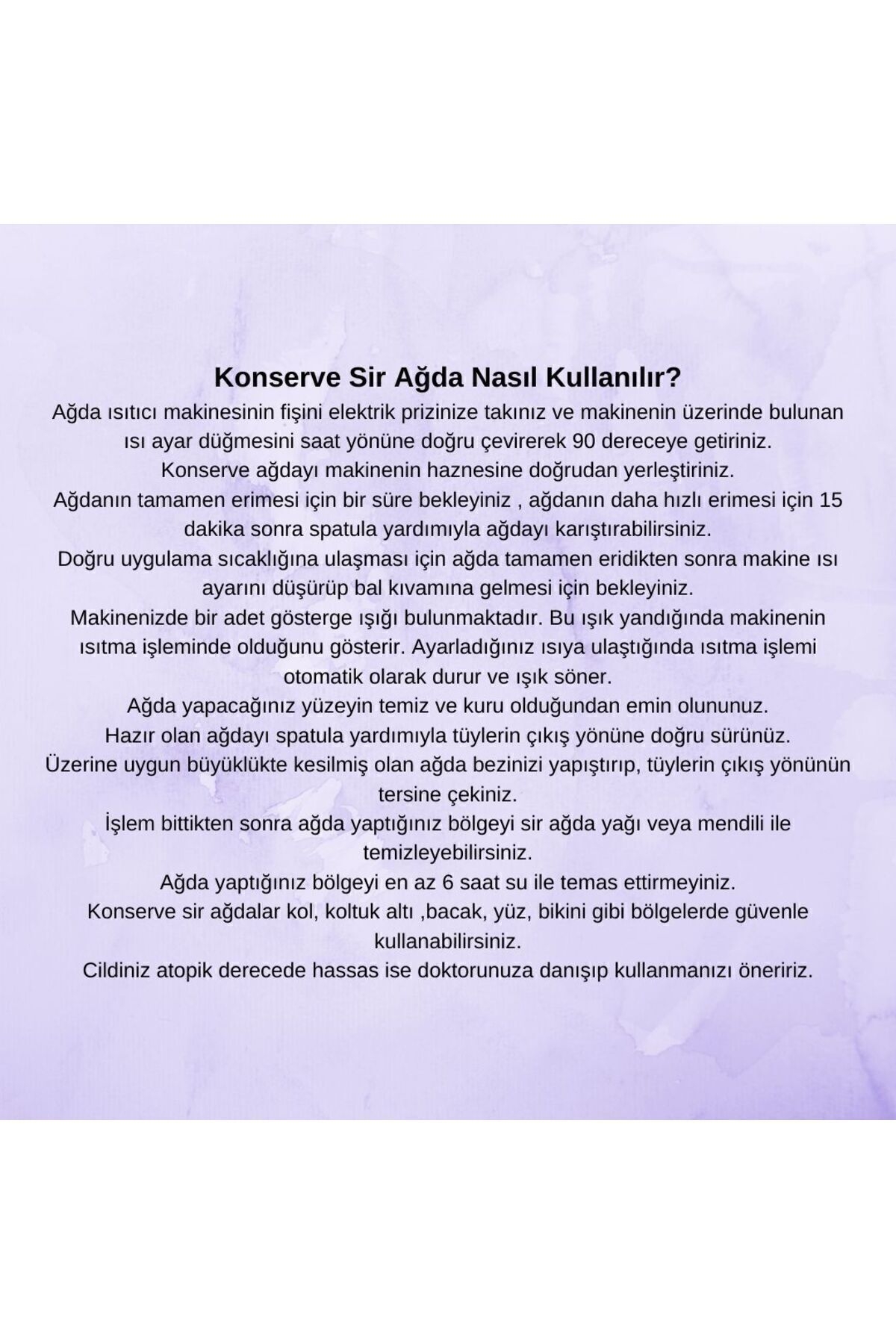 VİVOL DEPİROL 800 ML HAZNELİ 2 YIL GARANTİLİ MAKİNE +1 ADET 240 GR VİVET KAVANOZ AĞDA+ 4 ADET SPATULA+ 2 METRE BEZ+ 4 ADET YAĞLI SİR AĞDA TEMİZLEME MENDİLİ Depirol ağda makinesi nasıl kullanılır? Konserve sir ağda kullanmak için konserve sir ağdayı makinenin konserve haznesine yerleştiriniz; Kalıp sir ağda ya da inci boncuk ağda kullanmak için kullanacağınız kadar ağdayı makinenin ısıtma haznesine koyunuz; Ağda ısıtıcı makinesini elektrik prinize takınız; Makinenin üzerinde bulunan ısı yara düğmesini ağdanın hızlı bir şekilde hazır hale gelmesi için saat yönüne doğru çevirerek 90 dereceye getiriniz; Belli bir süre sonra ağda yumuşamaya başladığında ısı değerini düşürünüz ve ağda ısısını teni yakmayacak şekilde ayarlayınız; Makinenizde bir adet gösterge ışığı bulunmamaktadır; Bu ışık yandığında makinenin ısıtma işleminde olduğunu gösterir; Ayarladığınız ısıya geldiğinde ısıtma işlemi durur ve ışık söner; Ağdanızın hızlı şekilde kullanıma hazır hale gelmesi için, ısıtma işlemi başladıktan 15 dakika sonra spatula yardımı ile ağdayı karıştırmanız faydalı olacaktır; Kullandığınız sir ağda hazır hale geldiğinde (bal kıvamında) ağda yapacağınız yüzeyi temizleyiniz; Makine ile işiniz bittiğinde ısı ayar düğmesini sıfıra getiriniz ve makinenin fişini elektrikten çekiniz; Vivet sir ağda konserve pudralı 240 ml bol miktarda pudra içeren, yoğun kıvamlı, kremsi sürülen ve açık pembe renkte bir ağdadır; Özellikle terlemenin fazla olduğu bölgeler, bikini bölgesi, sıcak mevsimler, hassas bölgeler için tavsiye edilir; Parfüm içermediğinden esanslardan hoşlanmayan veya parfüm alerjisi olanlara da tavsiye edilir; Bronz tenlerde de güvenle uygulama yapılabilir; Ağda bezi ile uygulanır; Çekiş gücü yüksek olan bu ürün genellikle bacak ve kollardaki inatçı kıllar için idealdir; • %100 doğal reçineden üretilmiştir; • şeker içermez; • ağda bezi ile kullanılır; • çok kısa tüyleri dahi alır; • bir kutu, bir seferlik komple ağda için yeterlidir; • yüz dahil vücudun her bölgesinde kullanılabilir; • düzenli kullanıldığında tüyler daha seyrek ve geç çıkar; Dermatolojik olarak test edilmiştir; Konserve ağda kullanımı: Sir ağda tamamen eriyinceye kadar ısıtılır; Iyice karıştırılır ve spatula ile tüylerin çıkış yönüne sürülür; Üzerine ağda bezi yapıştırılıp tüylerin çıkış yönünün tersine çekilir; Işlem bittikten sonra ağda yaptığınız bölgeyi sir ağda yağı ile temizleyiniz; Ağda yaptığınız bölgeyi en az 6 saat su ile temas ettirmeyiniz; Yoksa küçük küçük sivilceler oluşabilir; Konserve sir ağdalar kol, koltuk altı, bıyık, yüz, bikini gibi bölgelerde kullanılır; Konserve ağdalar konserve ağda makinesi ile ısıtılarak kullanı;