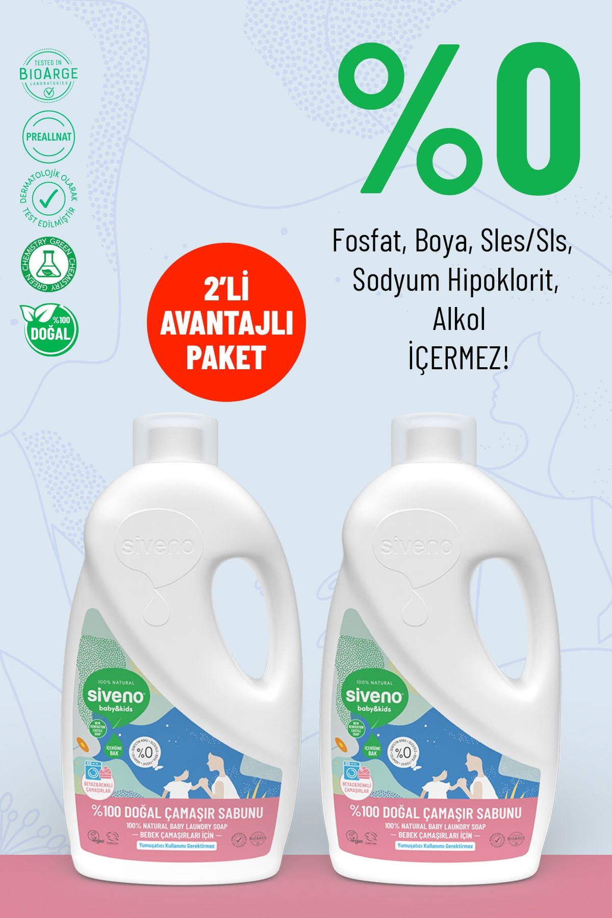 Siveno %100 Doğal Bebek Çamaşır Sabunu Kendinden Yumuşatıcılı Bitkisel Deterjan Vegan 1000 ml;Siveno Doğal Bebek Çamaşır Sabunu hindistan cevizi yağı ve karbonat içeriği ile tüm bebek kıyafetlerinde etkili temizlik sağlar.;Siveno Doğal Bebek Çamaşır Sabunu dermatolojik olarak test edilmiştir.;Doğal bebek çamaşır sabunu doğal içeriği ve vegan formülü ile çevre dostudur.;Doğal içeriği sayesinde bebeklerin cildine zarar vermez, güvenle kullanılabilir.;Ekstra yumuşatıcı kullanımı gerektirmez.;Fosfat, sentetik koku, phenoxyethanol, SLS/SLES, klor, amonyak, paraben ve boya İÇERMEZ!;Vegan sertifikasına sahiptir.;Siveno, hayvanlar üzerinde test yapmaz, Cruelty Free sertifikasına sahiptir.;Siveno, doğada geri dönüşen ambalajlar kullanır.; Yeraltı ve deniz sularını kirletmez, doğaya zarar vermez.;Kullanım Şekli:;Hassas, renkli ve beyaz tüm bebek çamaşırlarında kullanıma uygundur.; Tüm sıcaklıklarda (soğuk- sıcak) kullanılabilir.; 4-5 kg çamaşırlar için 60 ml, 5 kg ve üstü çamaşırlar için 90 ml kullanılabilir.; Elde ve çamaşır makinesinde kullanıma uygundur.; Yumuşatıcı kullanımı gerekmez.;Ürün İçeriği ve Detayları:;Hindistan Cevizi Yağı: Tüm kumaş tiplerinde derinlemesine temizlik sağlar.; İçeriğinde bulunan laurik, kaprik, kaprilik asit ile çamaşırlar yıpranmadan temizlenirken, kirlerinden etkin bir şekilde arınır.;Karbonat: Kireç önleyici görevi görür.; Bu sayede, yumuşatıcı kullanmaya gerek kalmaz.;Gliserin: Çamaşır yüzeylerindeki lekelerin çıkarılmasına yardımcı olur.