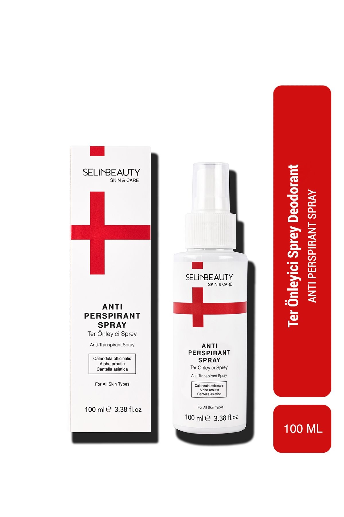 Selin Beauty Skin&Care El, Ayak ve Koltuk Altı Ter Önleyici Sprey bitkisel bileşenlerle desteklenmiş etkili bir bakım sunar.; Calendula officinalis ile cildi yatıştırırken, Alpha arbutin sayesinde cilt tonunu dengeler.; Centella asiatica, cildin yenilenmesine yardımcı olur.; PETA onaylı vegan formülüyle ferahlık sağlayan bu sprey, terlemeyi kontrol altına alarak uzun süre kalıcı bir rahatlık sunar.;